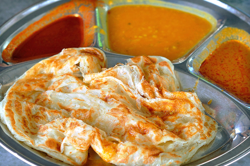 including roti telur (with egg) and roti boom (sweetened). Roti canai showcases Malaysia’s culinary fusion and street food culture.