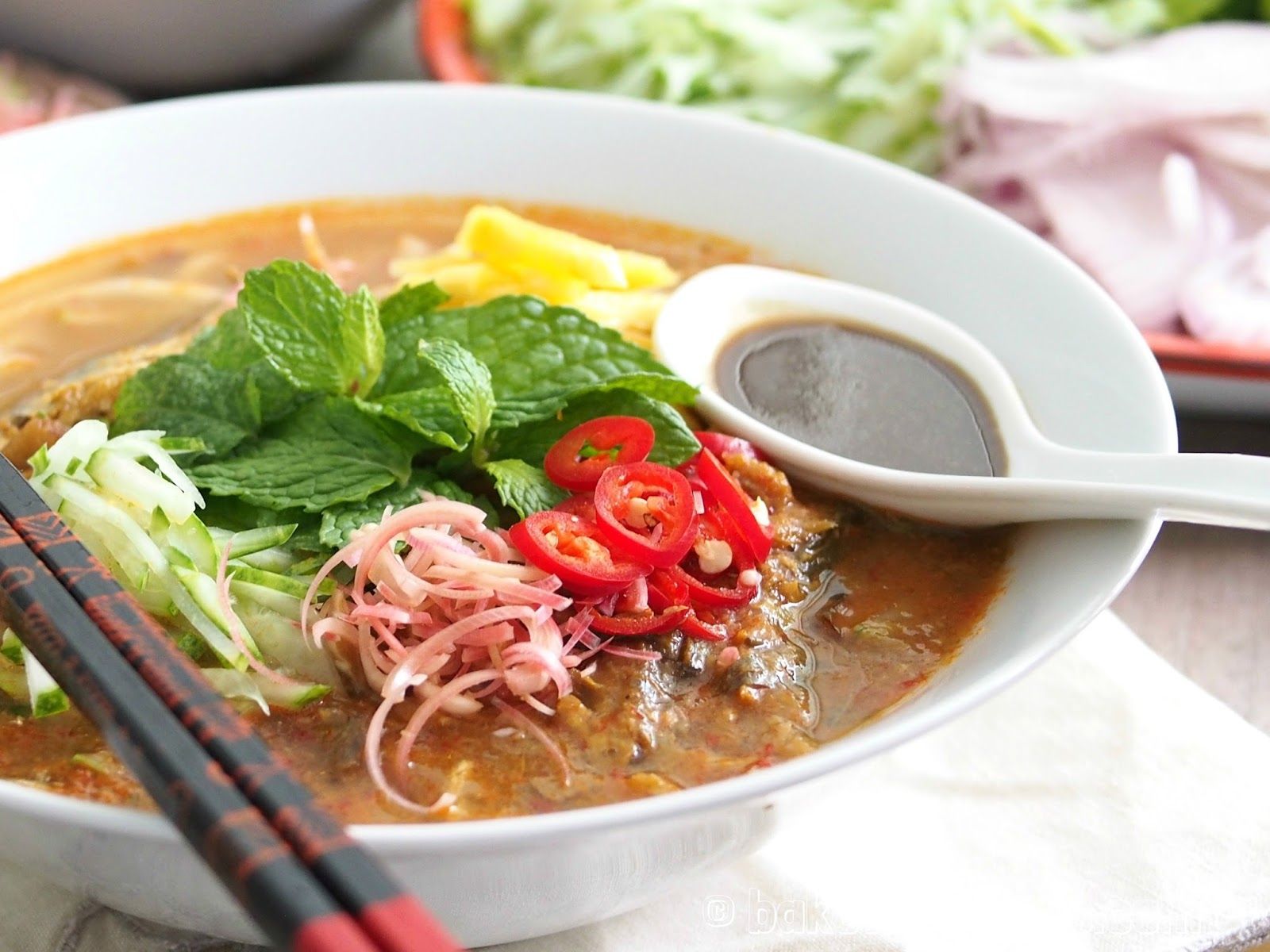 Laksa Penang, also known as Asam Laksa, is a tangy, spicy noodle soup made with thick rice noodles in a tamarind-based fish broth. Mackerel is simmered with lemongrass, galangal, and chili, creating a bold, sour flavor. Topped with shredded cucumber, pineapple, mint, and torch ginger flower, it’s served with a spoonful of pungent shrimp paste. This dish is a Penang icon, offering a refreshing yet fiery taste that captures the island’s vibrant street food culture.